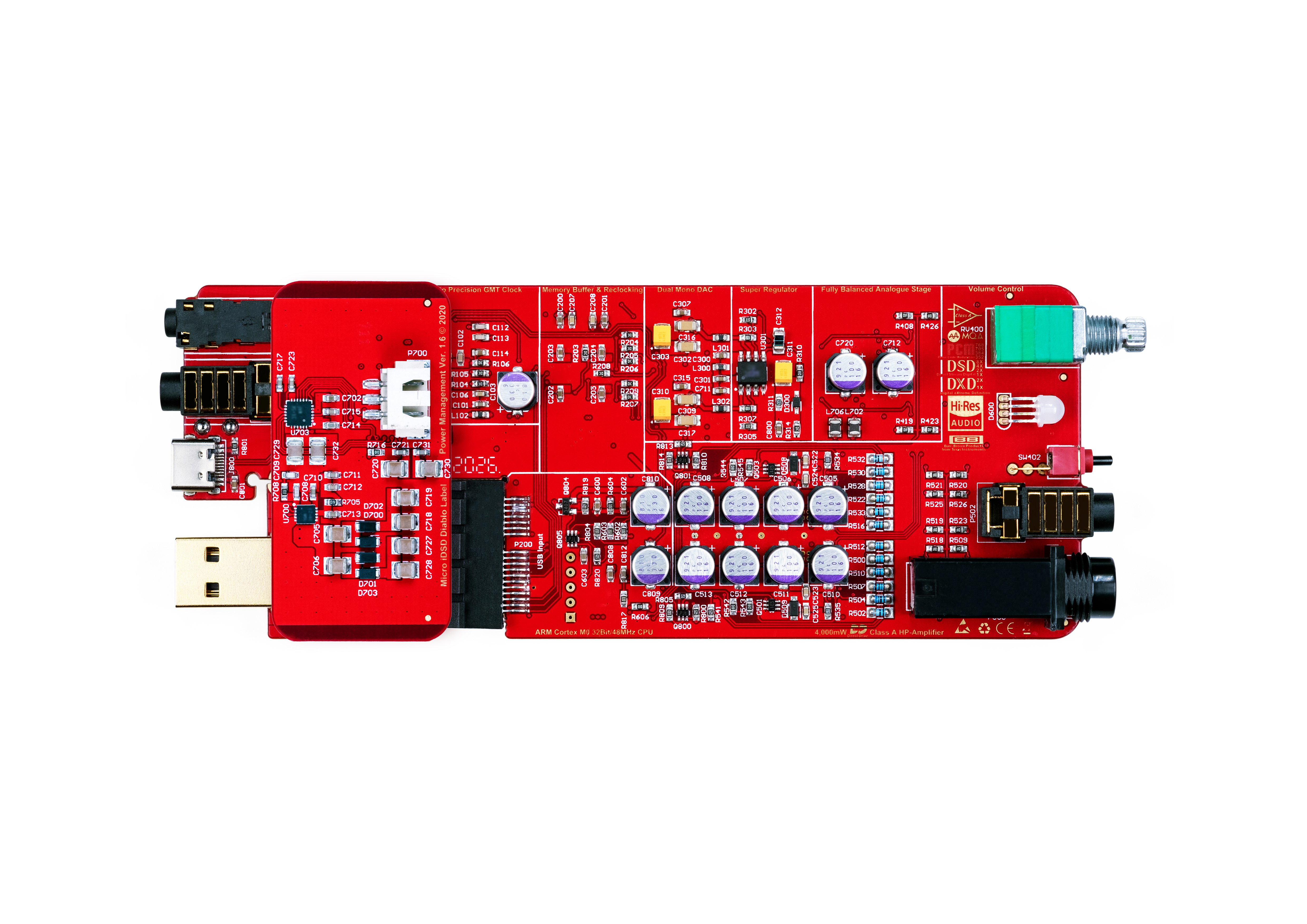 High-bandwidth power supply circuity is dedicated to each critical part of the iDSD Diablo’s design, with independent linear regulation delivering excellent PSRR (Power Supply Rejection Ratio) performance. The headphone amp stage eschews IC regulators in favour of Panasonic OS-CON capacitors, delivering 2320uF between them. The DAC section benefits from an ultra-low-noise regulator with additional passive filtering, reducing high order harmonic distortion and, in turn, jitter. Even the USB input stage benefits from dedicated regulation and multi