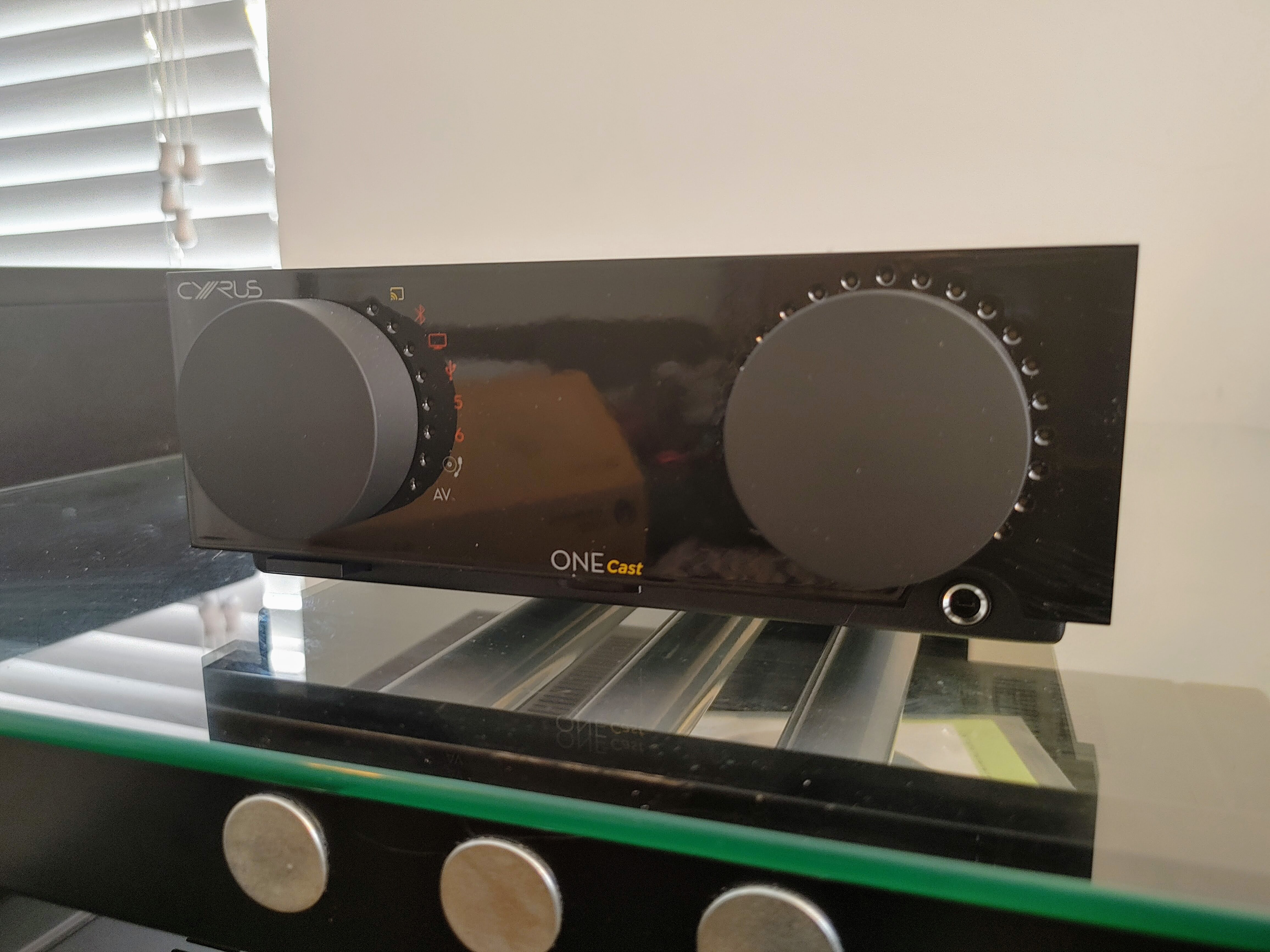 The ONE Cast is a handsome unit with a glossy black face and two large operation knobs on the front panel, one for volume and one to select the source. It follows Cyrus Audio’s traditional half-width format, half the width of a standard component but about an inch and a half deeper.